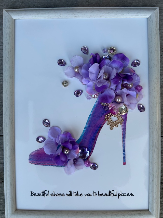 『いい靴は素敵なところへ案内してくれる・・・』 そんなことわざがヨーロッパにはあるそうです 靴が持ち主を素敵な場所に連れて行ってくれる だから女の子は素敵な靴を履くと幸せが訪れる・・・ でも、いい靴は簡単にプレゼント出来ないから、そんな思いを込めて フラワーフレーム作りました♪ 色の持つ意味やイメージと一緒にギフトにいかがですか 紫:華麗・上品・癒し・優雅・神秘・高貴 『紫の靴は素敵な場所に連れて行ってくれる 心奪われるあの場所に 優美な癒しの場所に連れて行ってくれる魔法の靴』 春から新生活を始める方に・・・ 何かに挑戦されてる人に・・・ 素敵な出会いがありますように・・・ A4サイズ(縦32✖️横23) 写真の商品がお手元に届きます