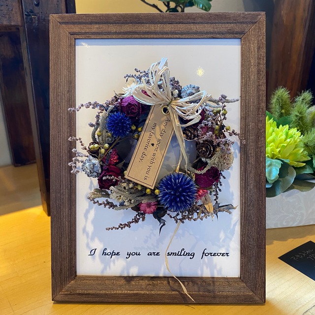 ドライフラワーで作ったリースフレームです。 リースの形には終わりがなく、『永遠』という意味があります。 『幸せが永遠に続きますように』という願いを込めて作りました。 I hope you are smiling forever ずっと笑顔でいてね♡ のメッセージ入りです。 サイズ A5判 ※ご注文の際の注意点 ご注文日時指定は承りますが、コロナの影響で状況が日々変わり、交通事情やその他諸事情により遅延が発生してる状況です 混雑を避ける為、母の日当日ではなく早めの発送や母の日を過ぎての発送をお勧めしてます ご了承頂けますようお願い致します